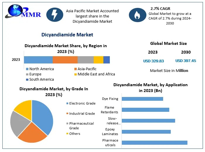 Dicyandiamide Market was valued US$ 329.83 Mn. in 2023 and is expected to grow US$ 397.45 Mn. by 2030, at a CAGR of 2.7% during the forecast period.