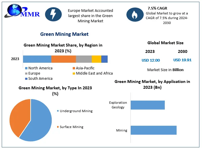 Green Mining Market size was valued at US$ 12.00 Bn. in 2023 and the total revenue is expected to grow at 7.5 % through 2024 to 2030, reaching nearly US$ 19.91 Bn.