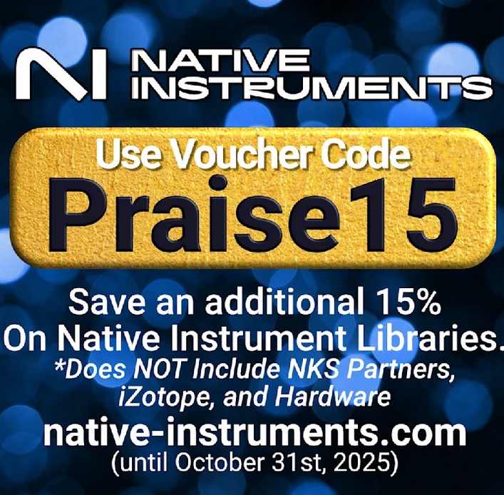 from now until October 31st, save an additional 15% off Native Instruments libraries and hardware, NKS Partner library titles, and iZotope effects when you use your personal voucher code “Praise15”.